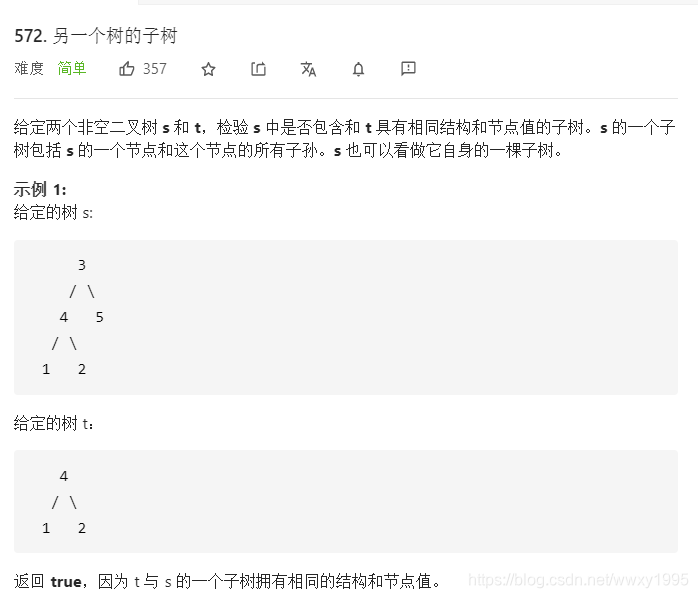 class Solution {public: bool isSubtree(TreeNode* s, TreeNode* t) { if(s==NULL) return false; if(t==NULL) return true; return isSubtree(s->left,t) || isSubtree(s->right,t) || isSameTree(s,t); } bool isSameTree(TreeNode* s, TreeNode* t){ if(s==NULL&&t==NULL) return true; else if(s==NULL||t==NULL) return false; else if(s->val==t->val) return isSameTree(s->left,t->left) && isSameTree(s->right,t->right); else return false; }};